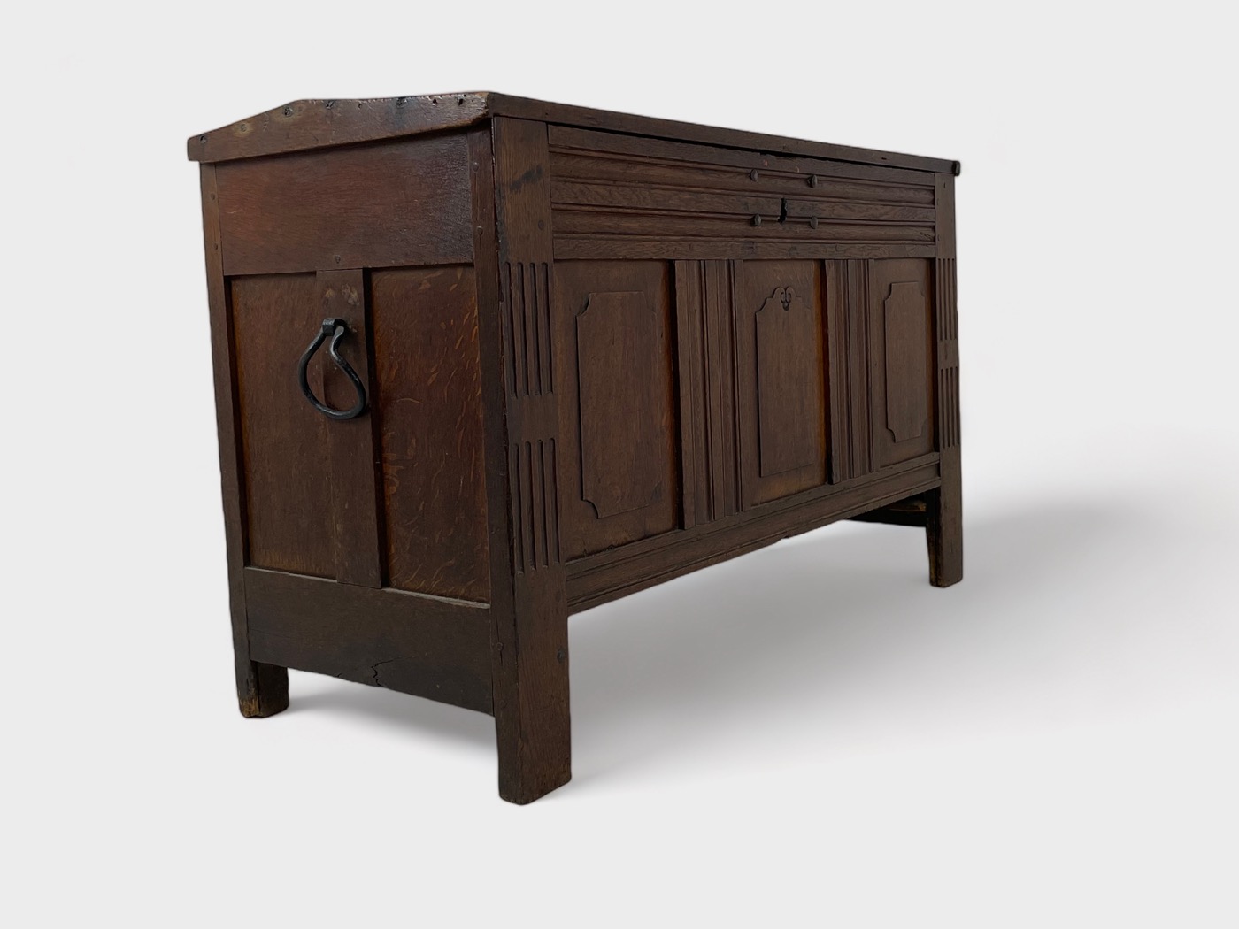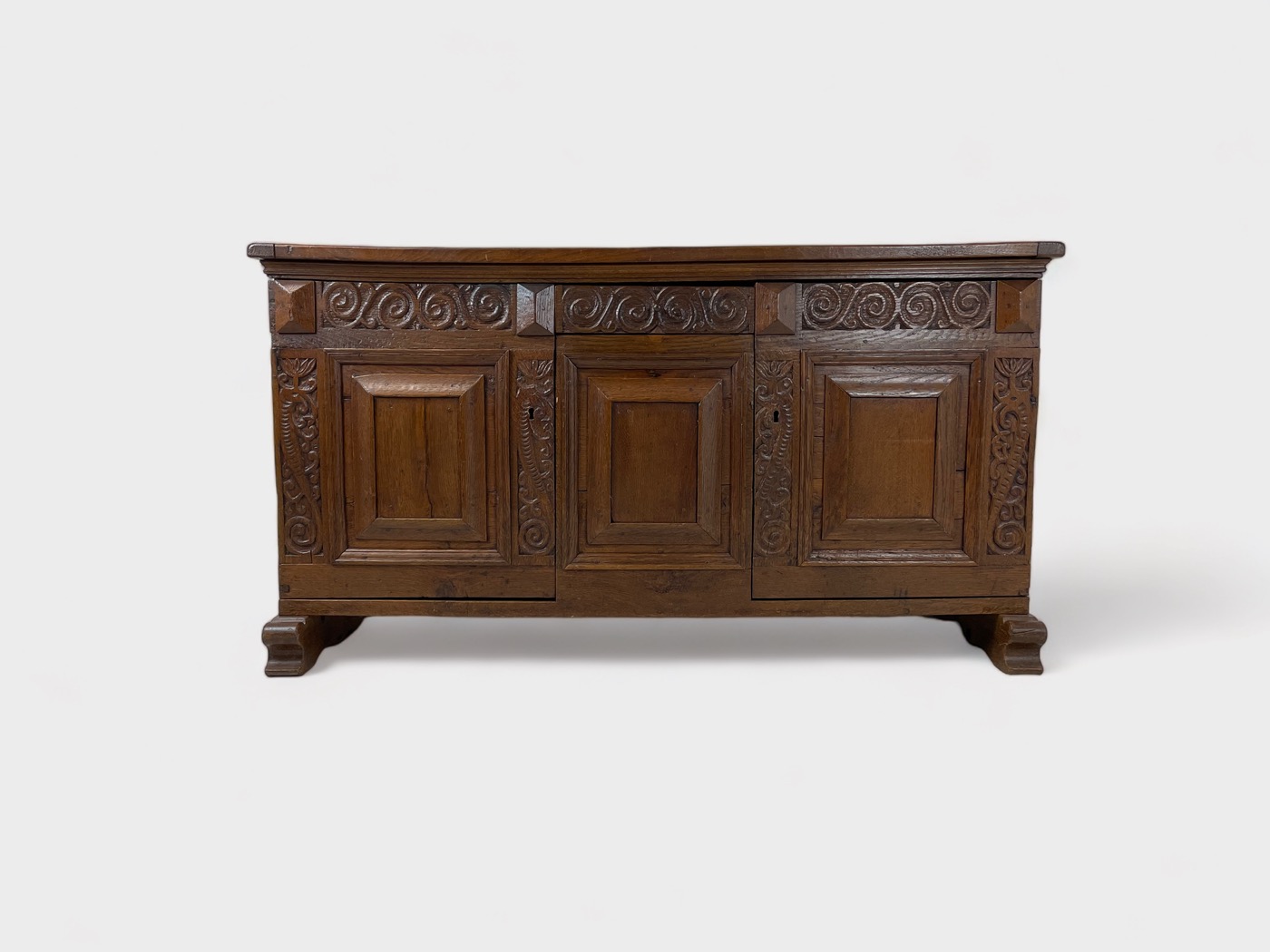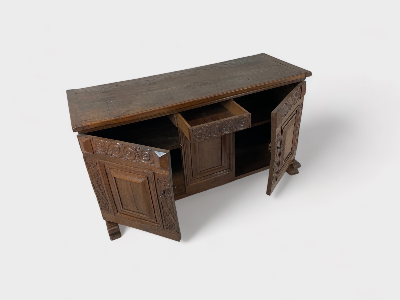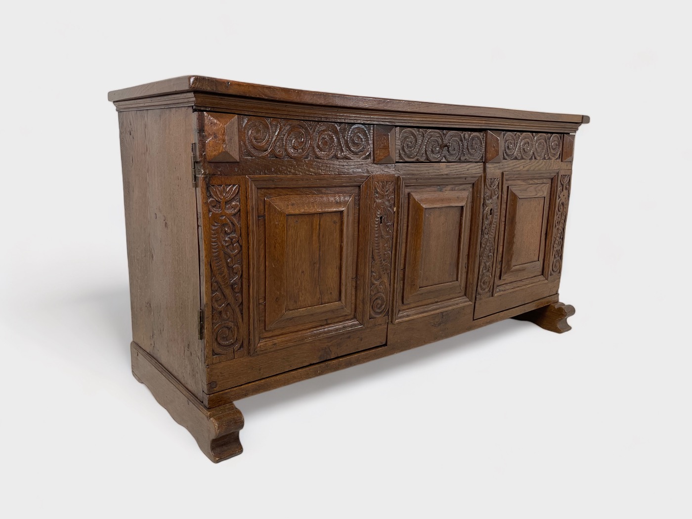 | Info | Eikenhouten kist vermaakt tot lage kast met snijwerk, lade, paneeldeuren in het front en rustend op slofpoten |