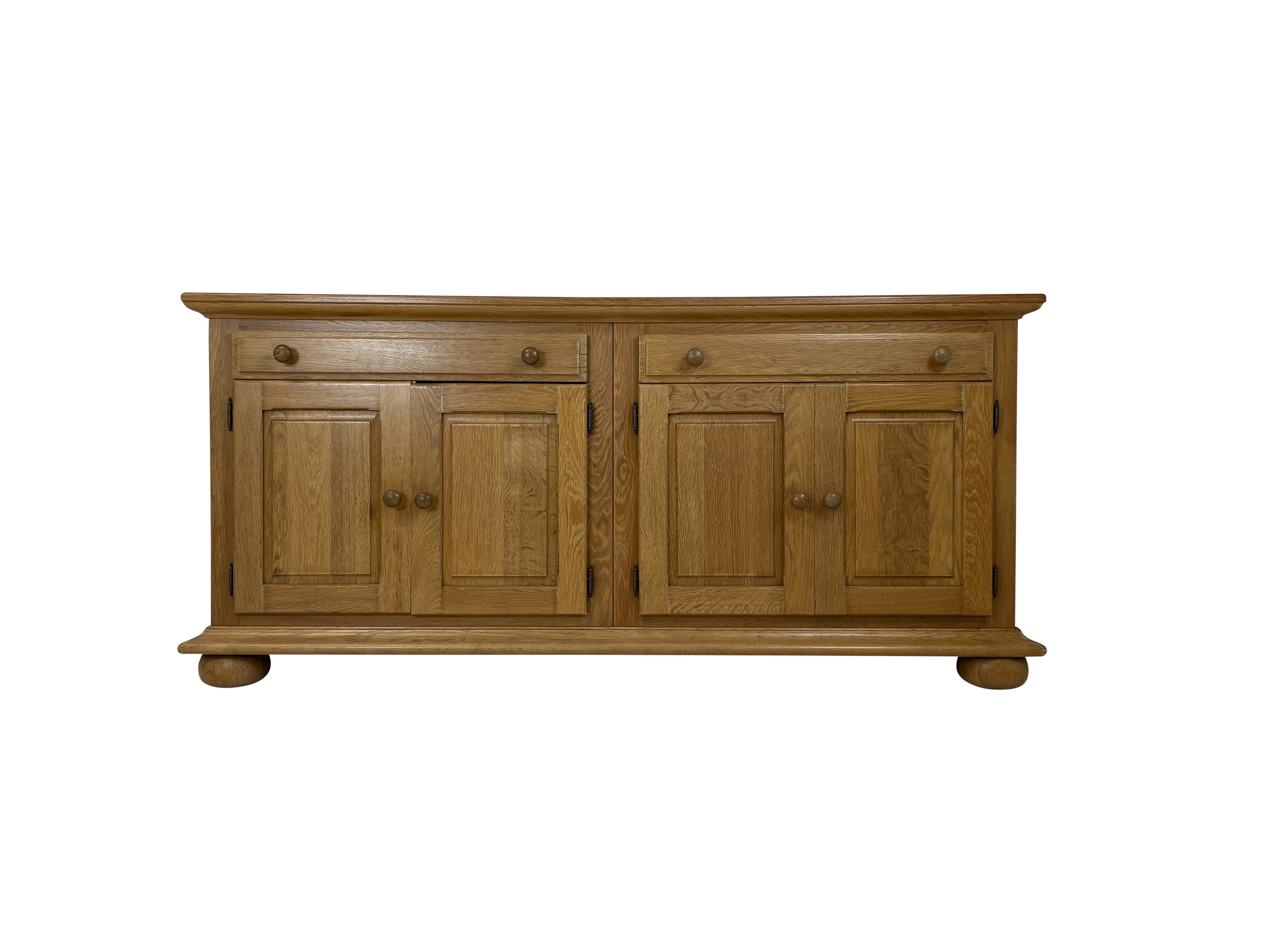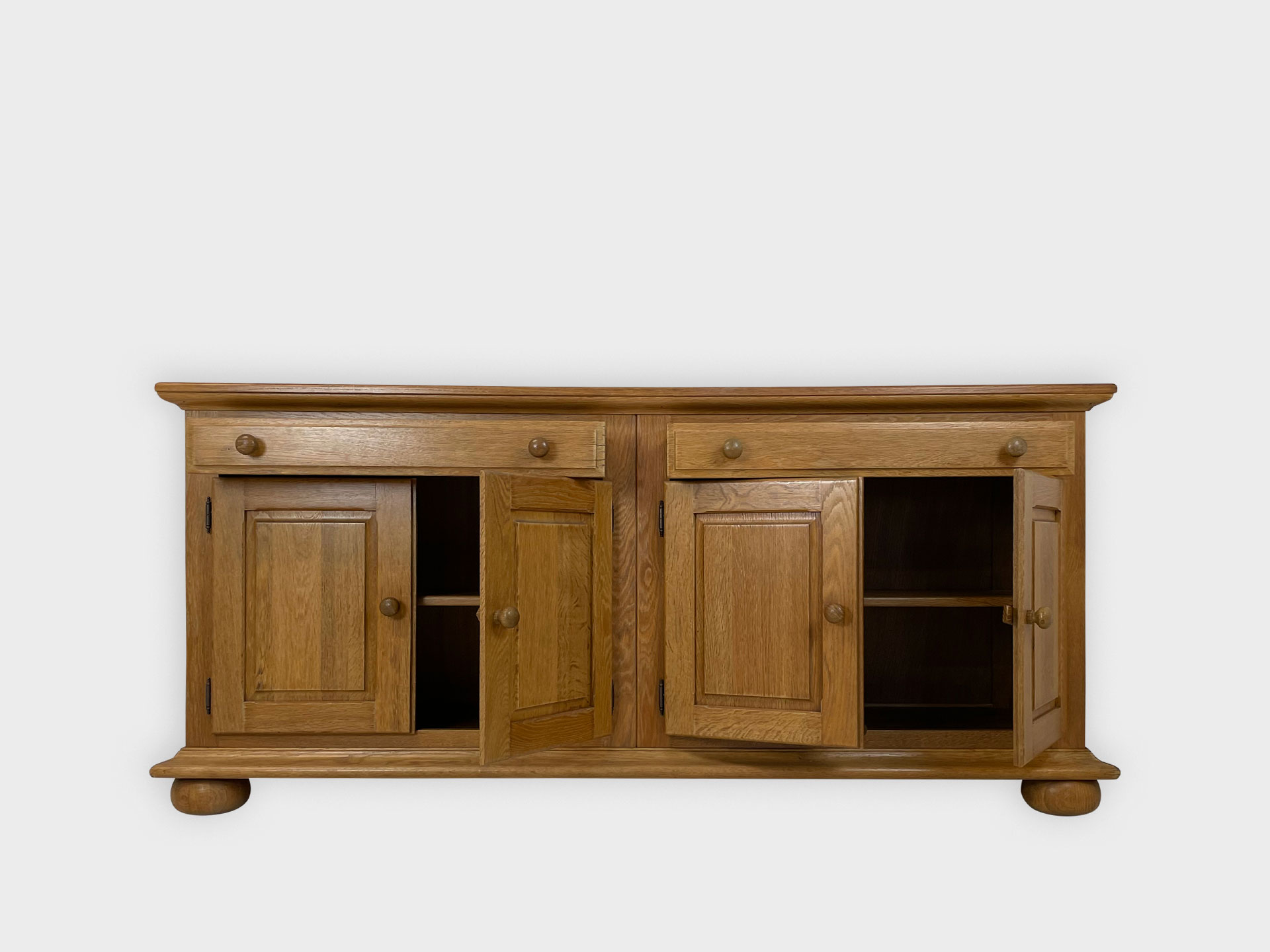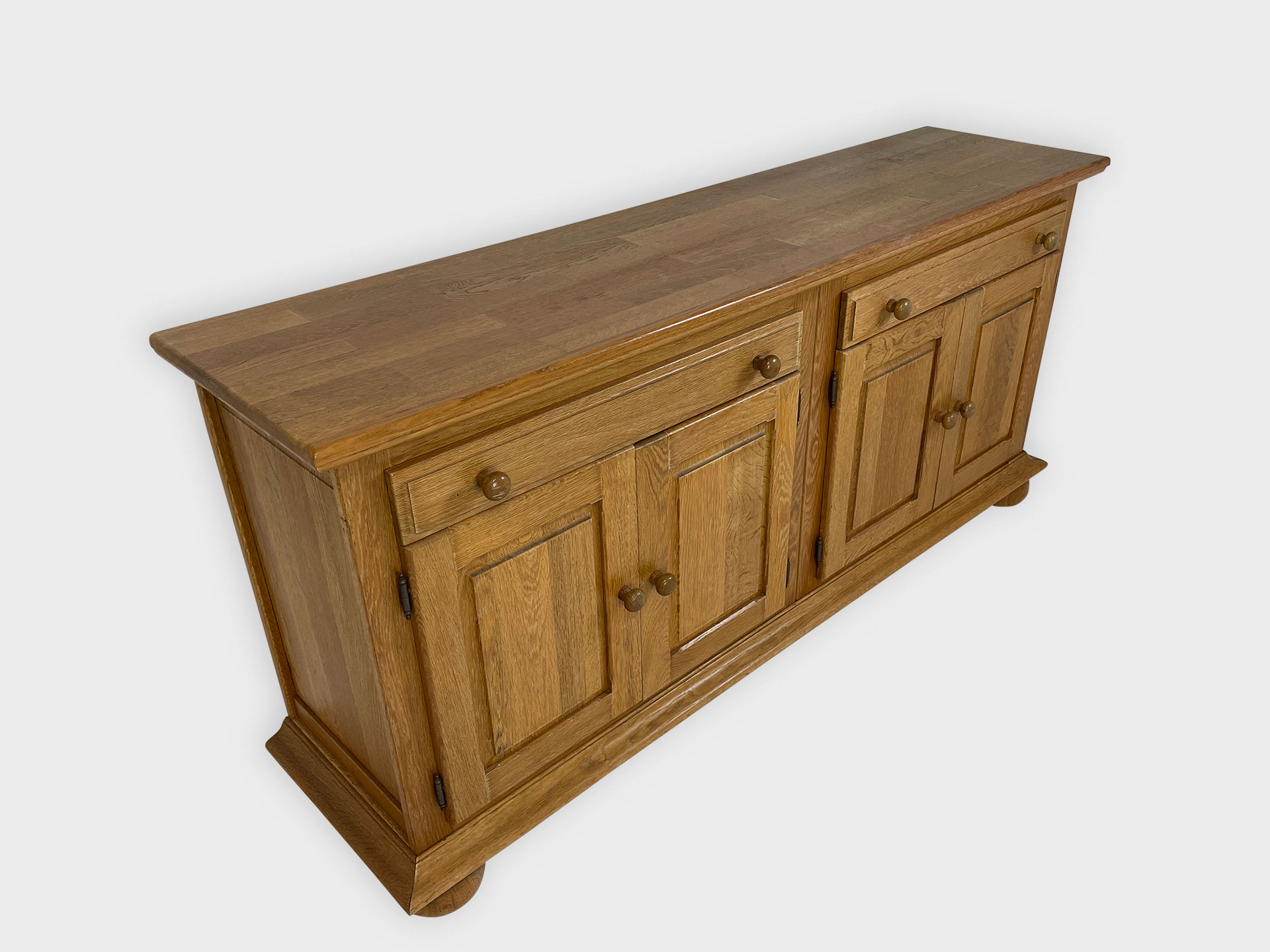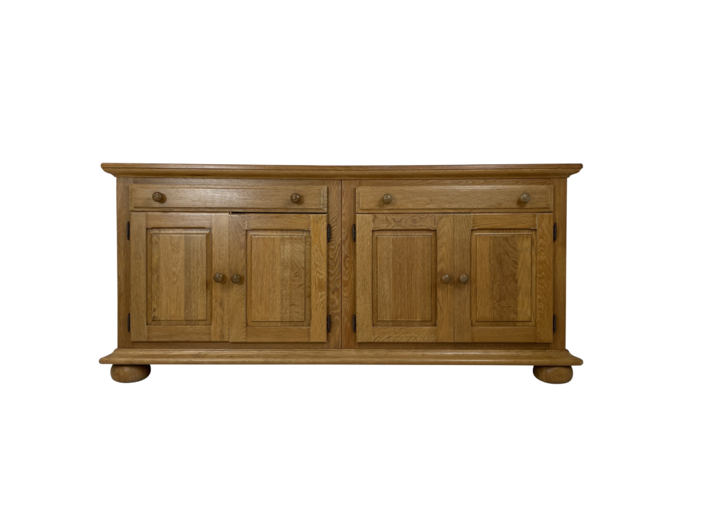 | Info | Eikenhouten kist vermaakt tot lage kast met snijwerk, lade, paneeldeuren in het front en rustend op slofpoten |