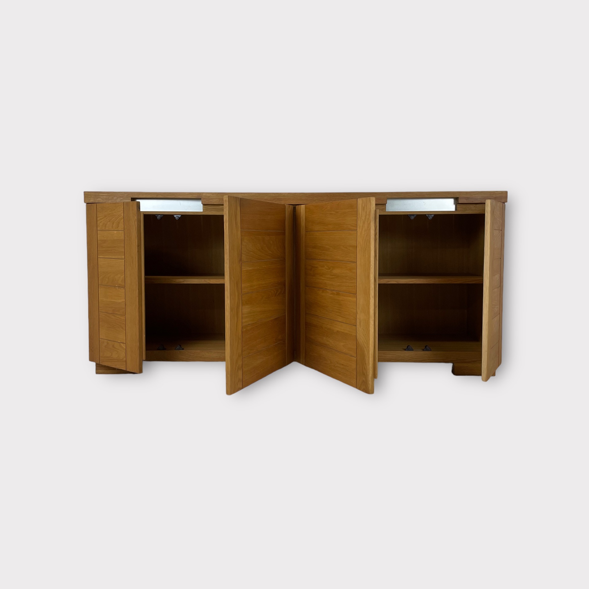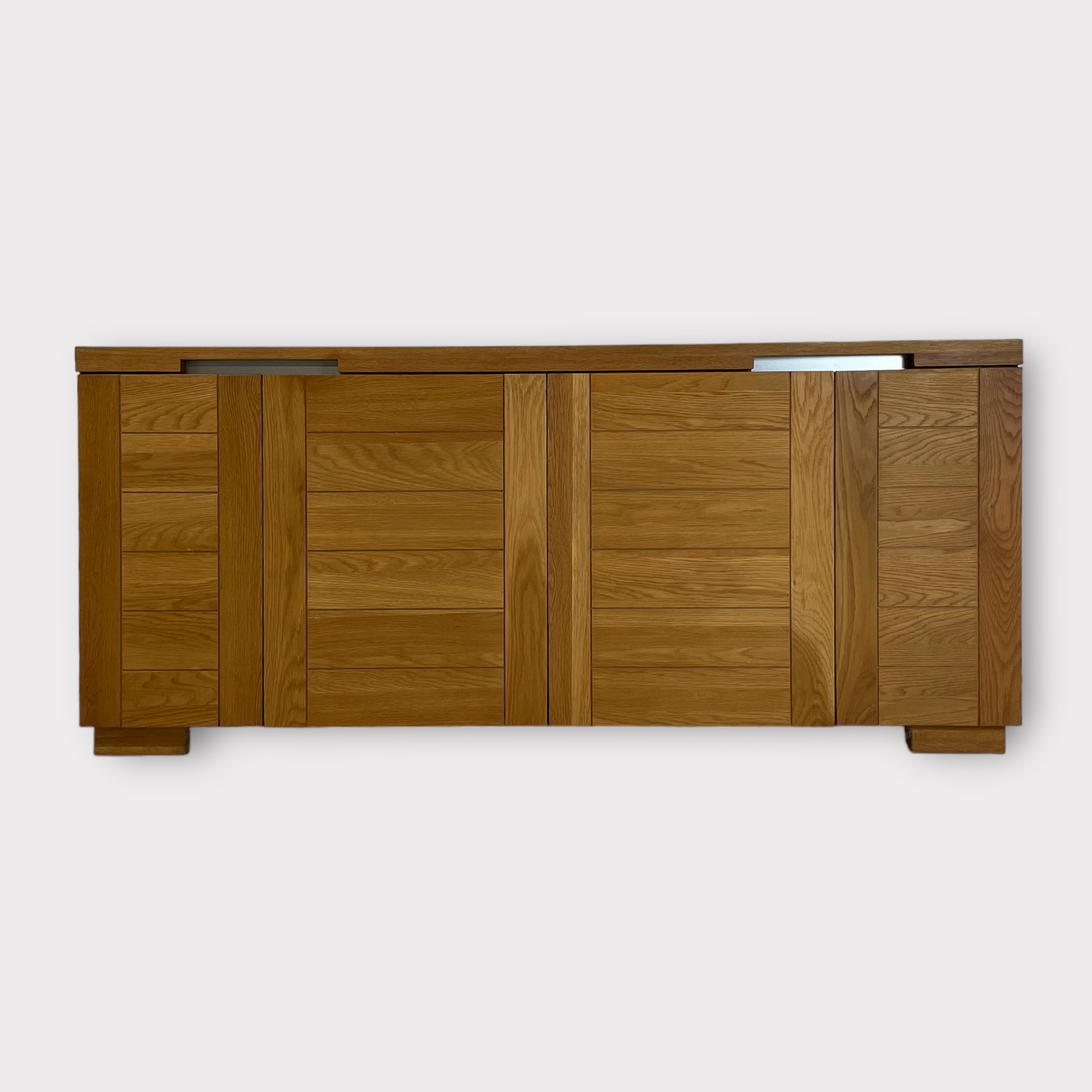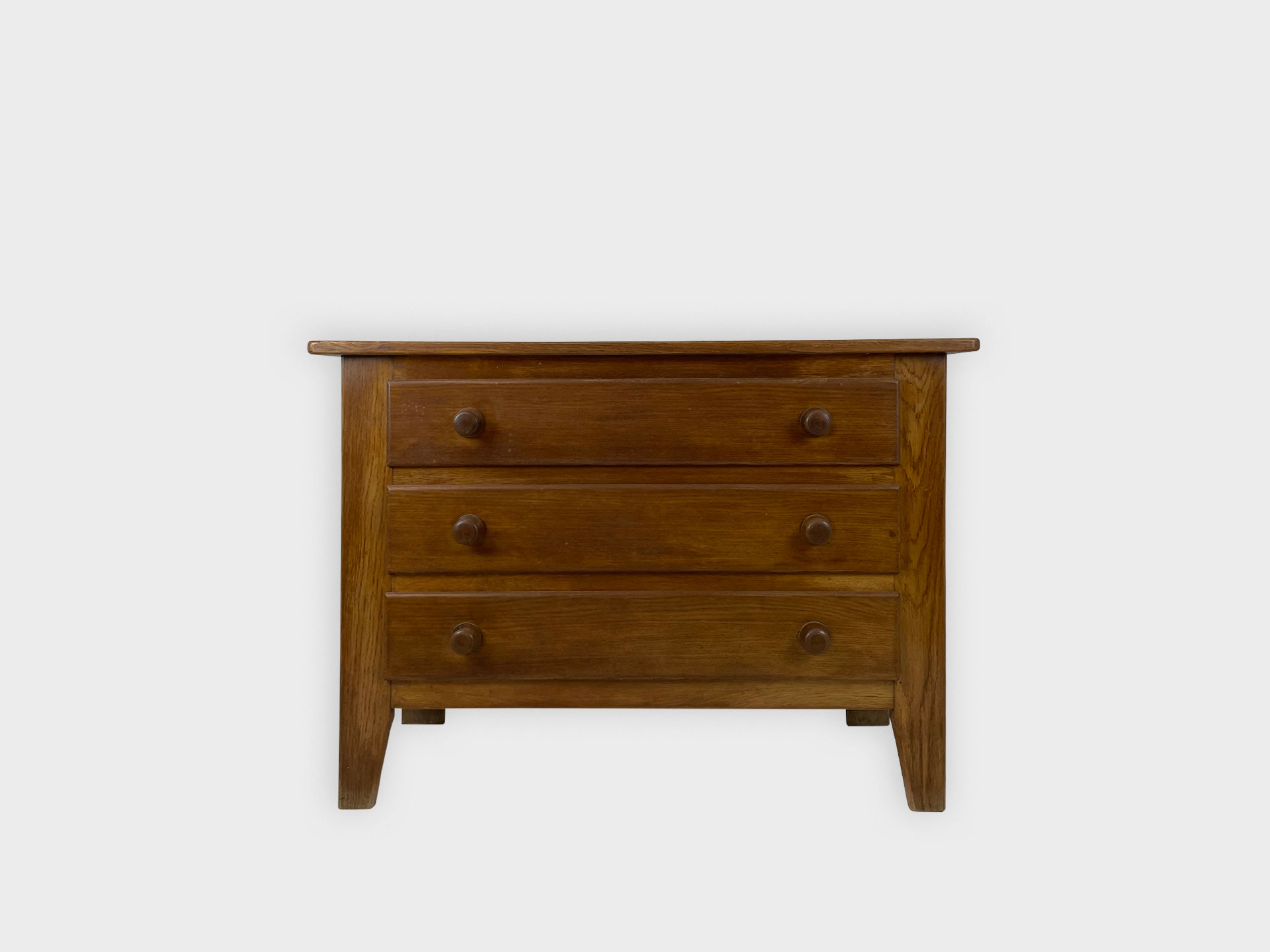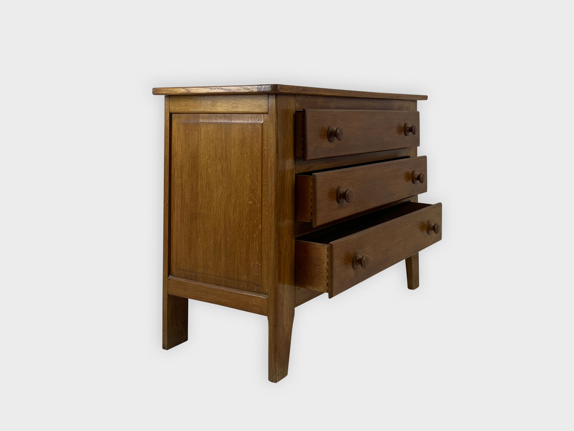 | Info | Eikenhouten kist vermaakt tot lage kast met snijwerk, lade, paneeldeuren in het front en rustend op slofpoten |