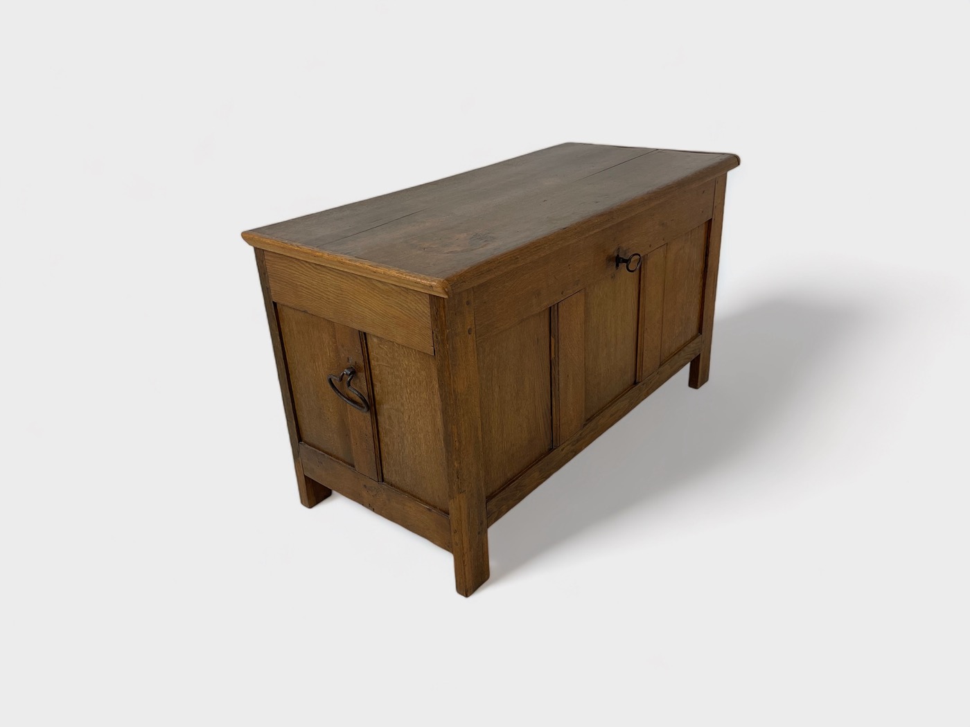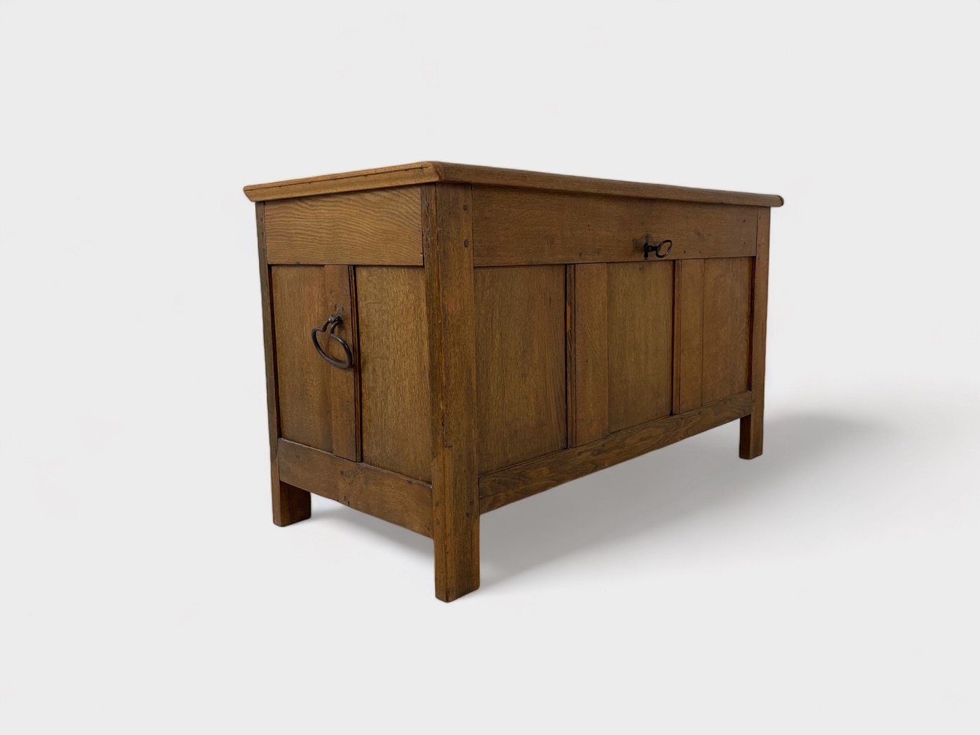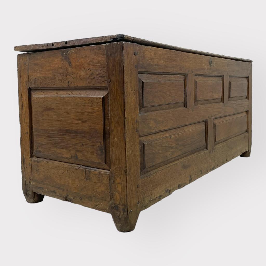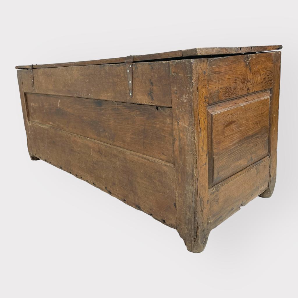 | Info | Hollandse eikenhouten kist met panelen in het front en smeedijzeren beslag, 18e eeuw |
