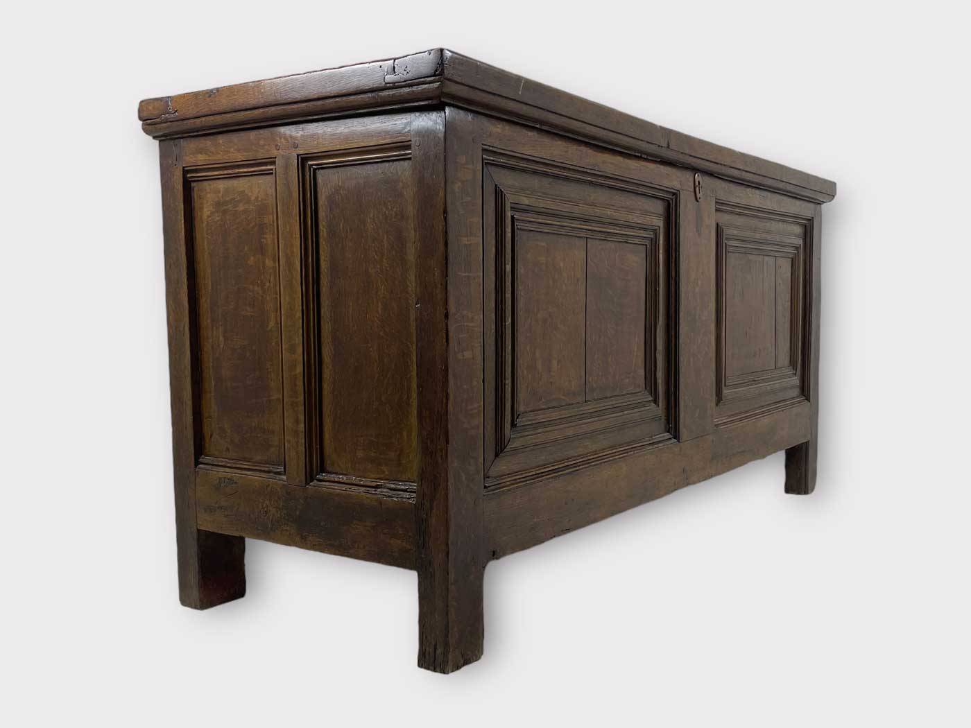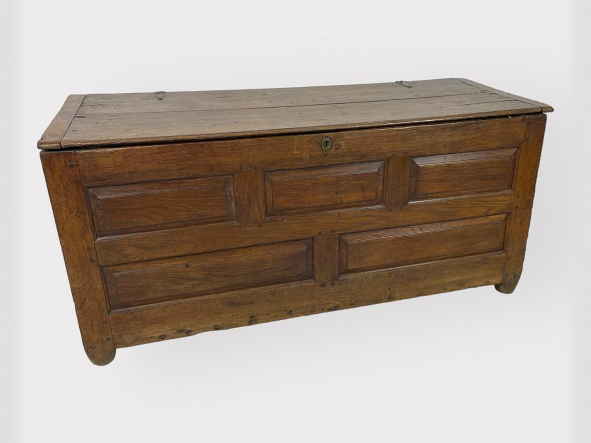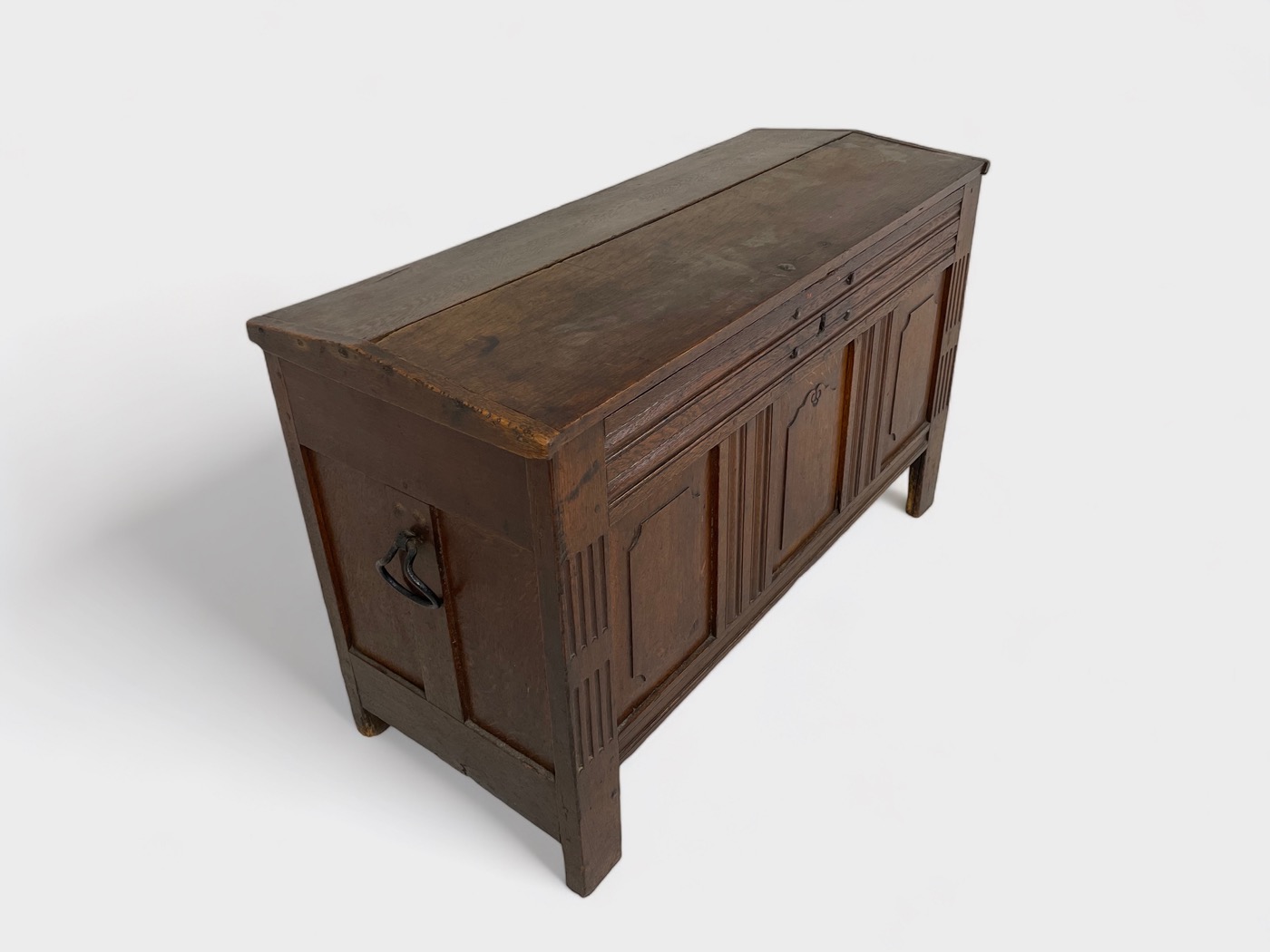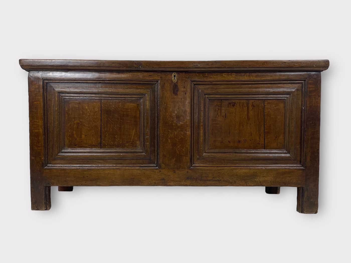| Info | Hollandse eikenhouten kist met panelen in het front en smeedijzeren beslag, 18e eeuw |