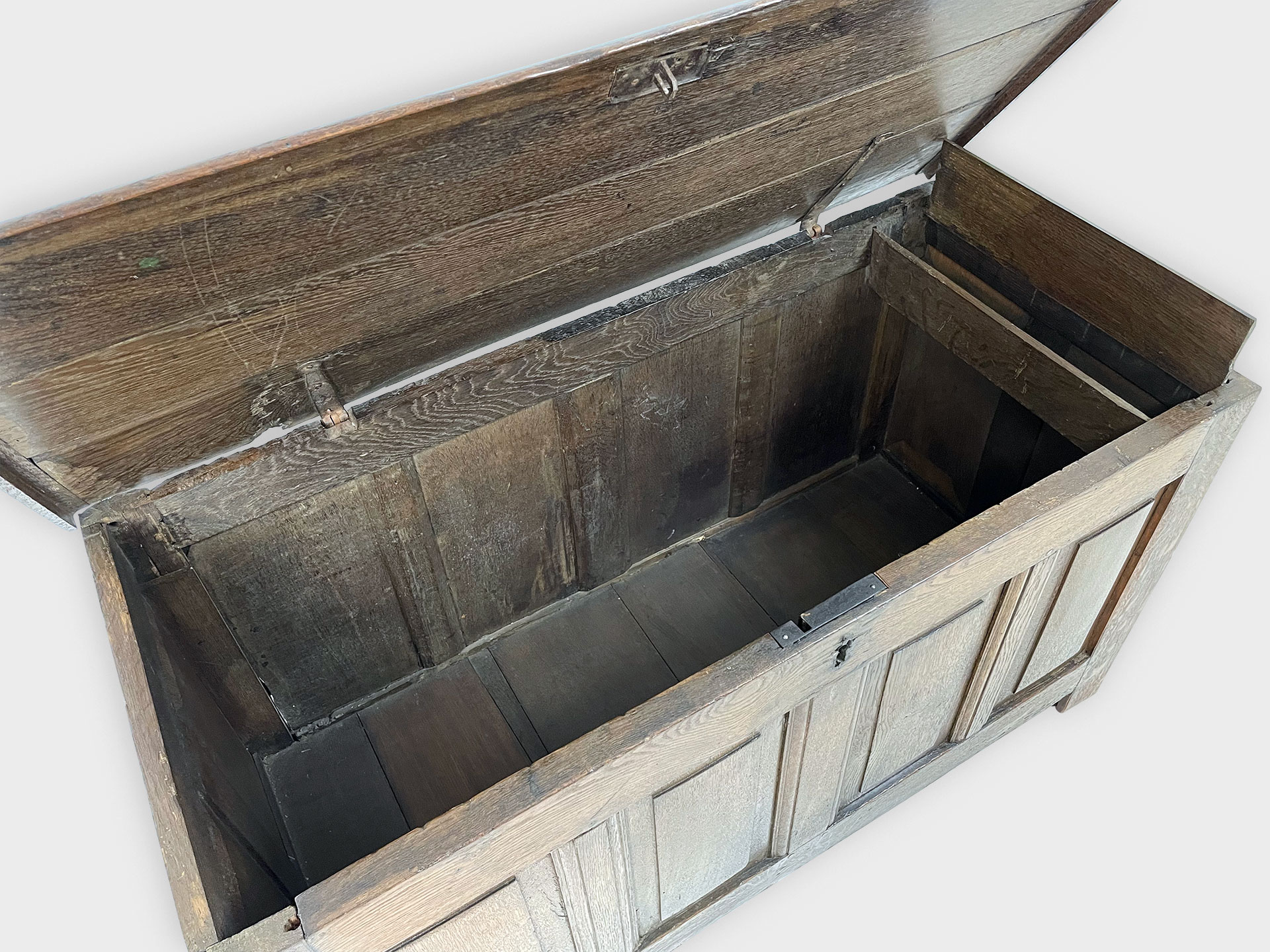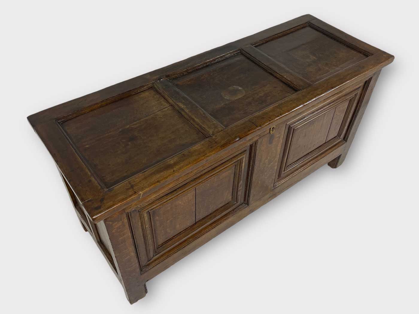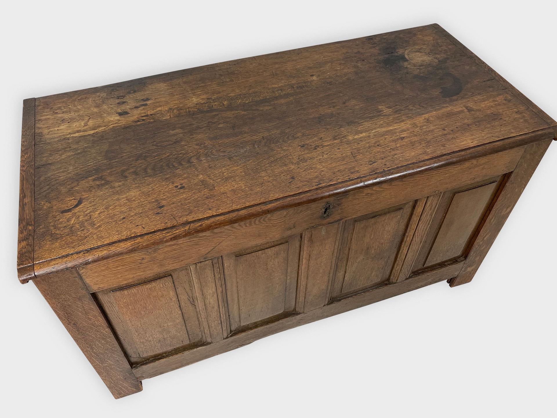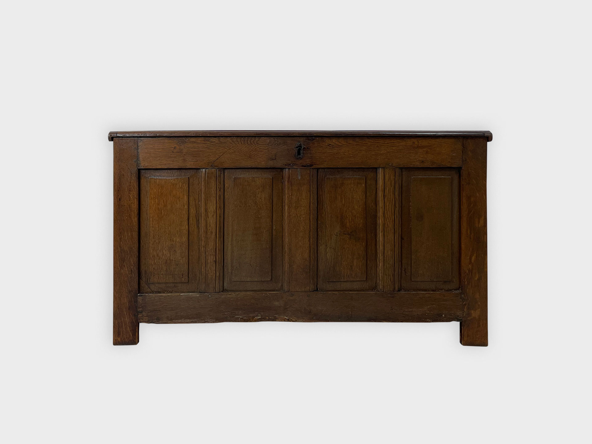 | Info | Hollandse eikenhouten kist met panelen in het front en smeedijzeren beslag, 18e eeuw |