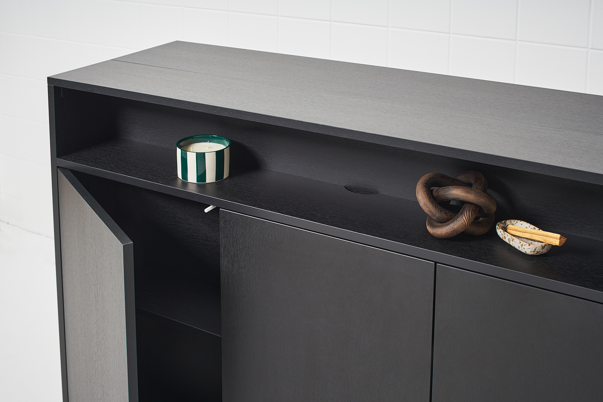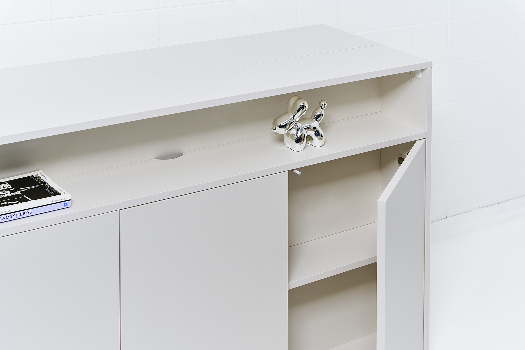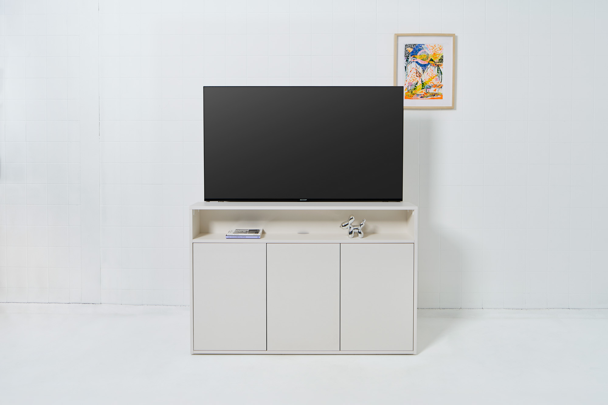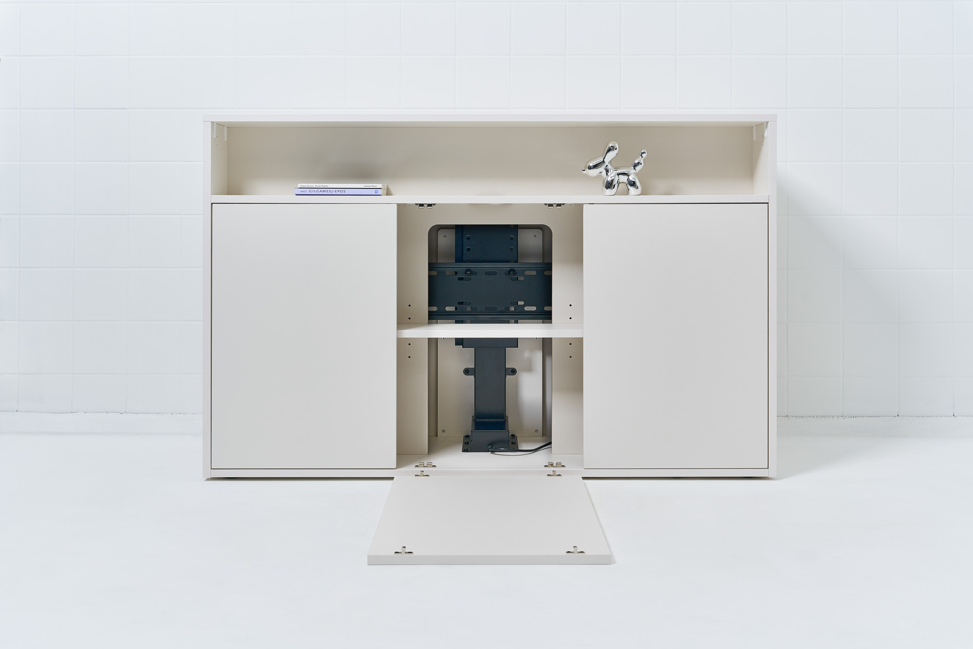 Ook tegen de achterwand van onze meubels kun je vanuit het tv lift compartiment randapparatuur vastschroeven. Je hebt hier ongeveer 10 cm dieptemaat voor. De breedte is afhankelijk van de maat van de kast.