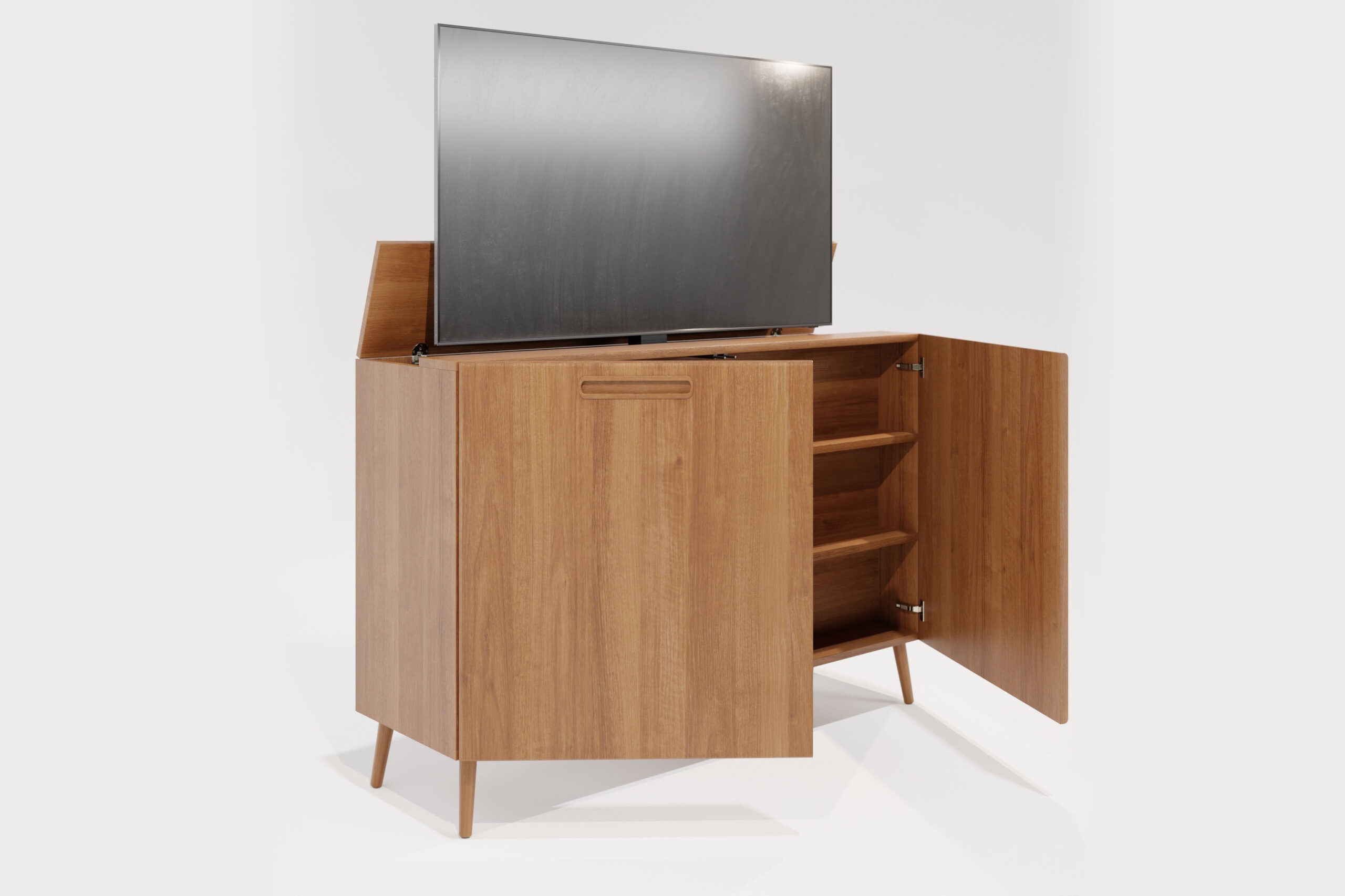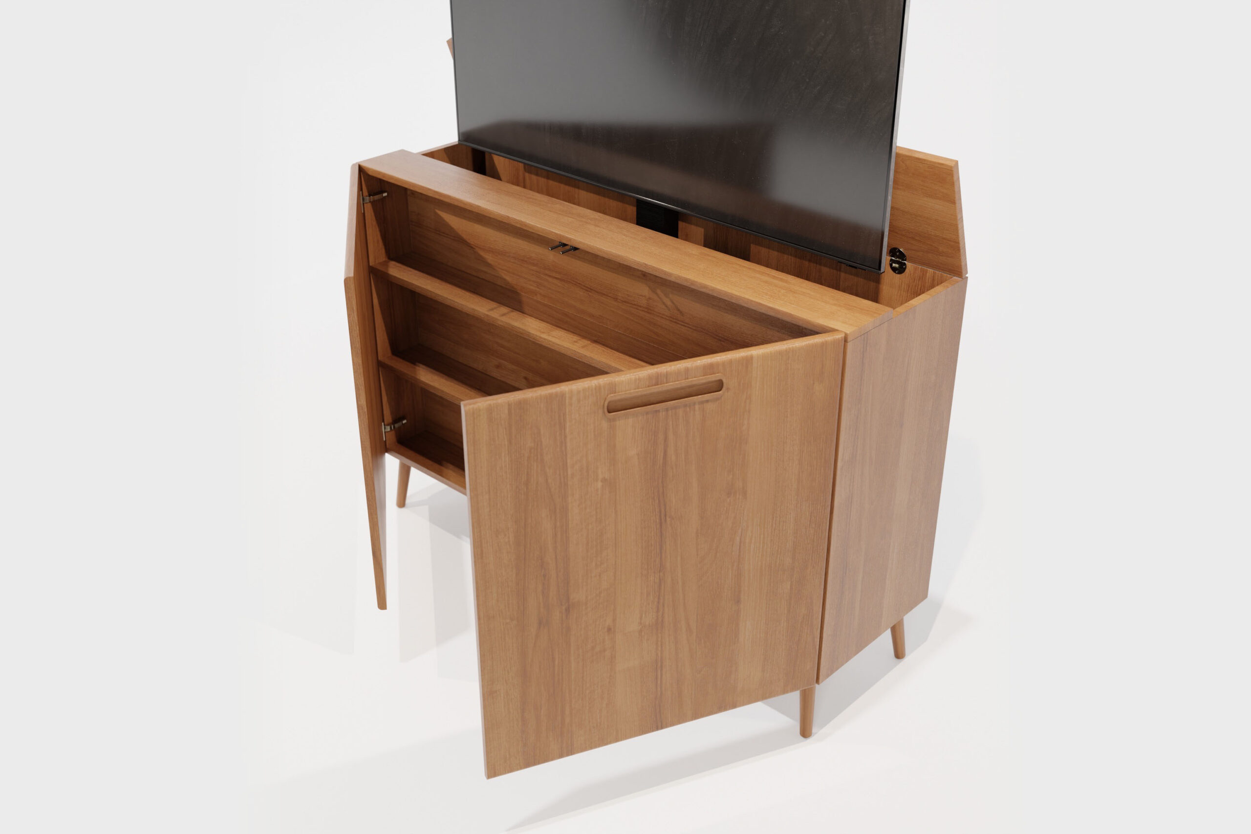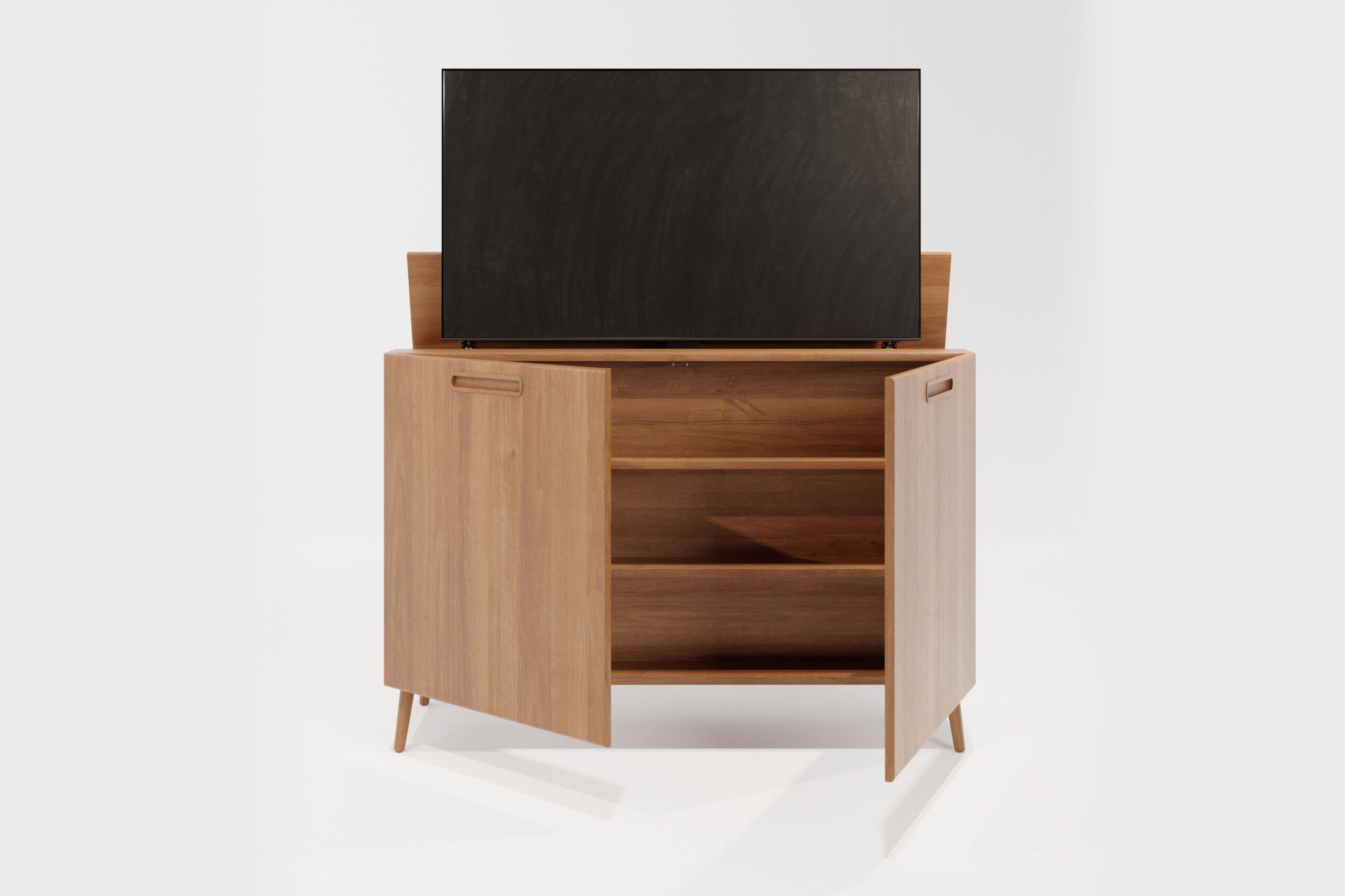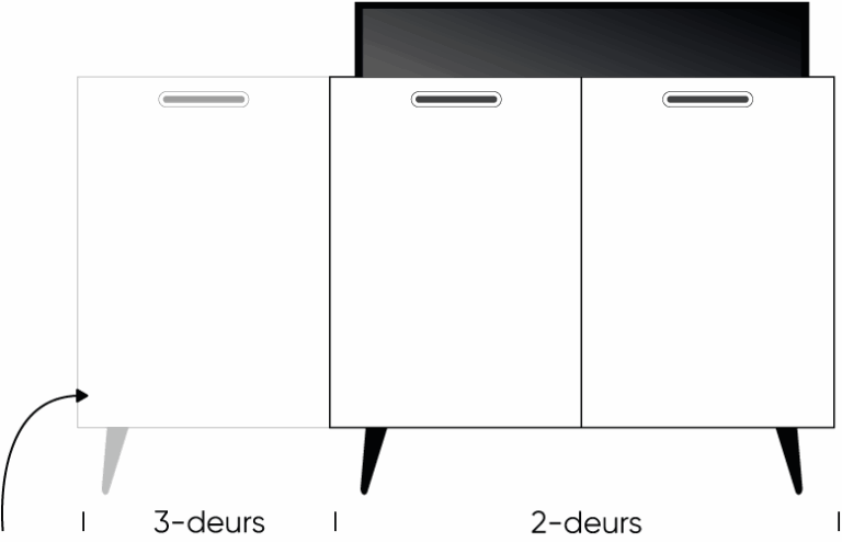 Bij het 3 deurs model van de 43″ en het 55″ kast plaatsen we een extra compartiment aan het meubel welke gebruikt kan worden als opbergruimte. Het compartiment kan zowel links of rechts.