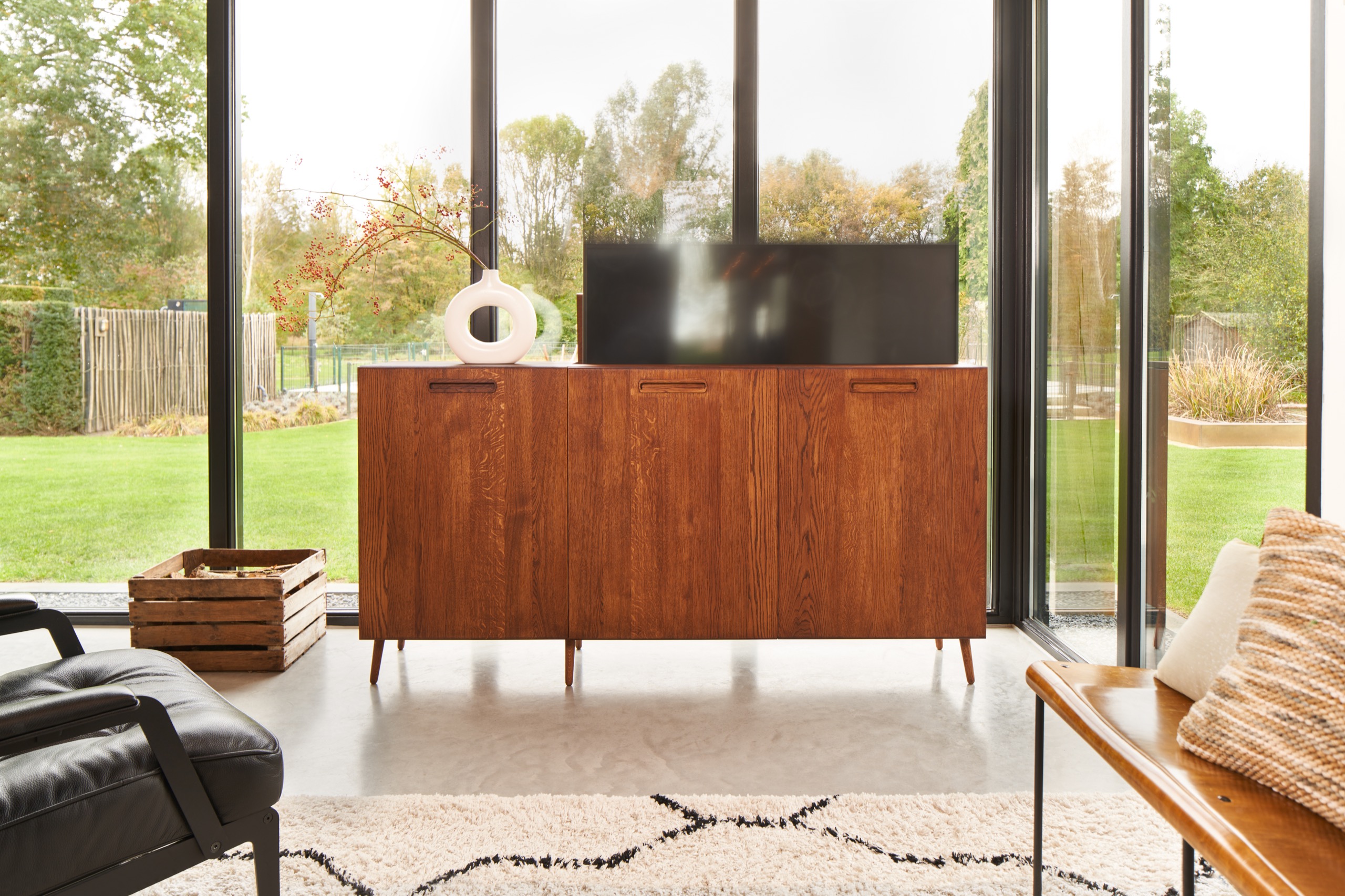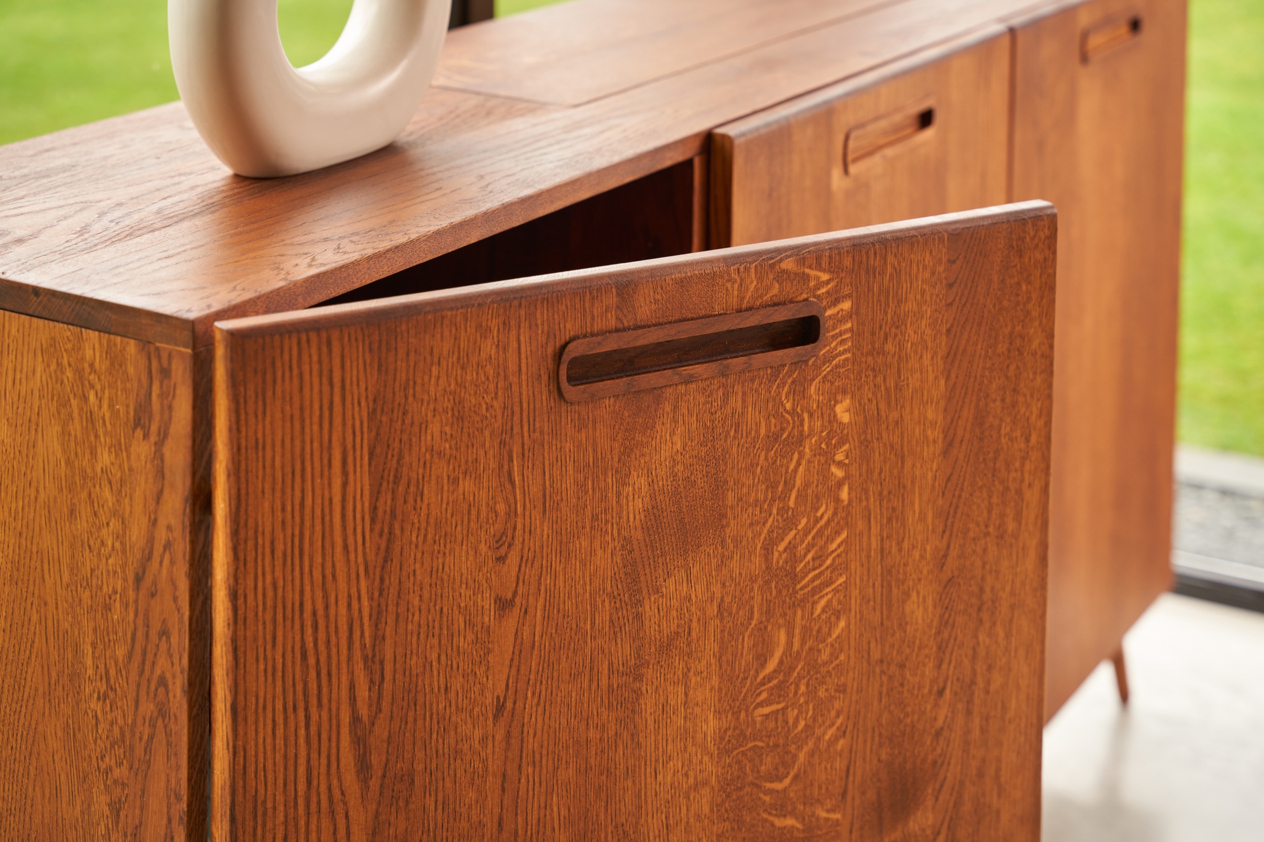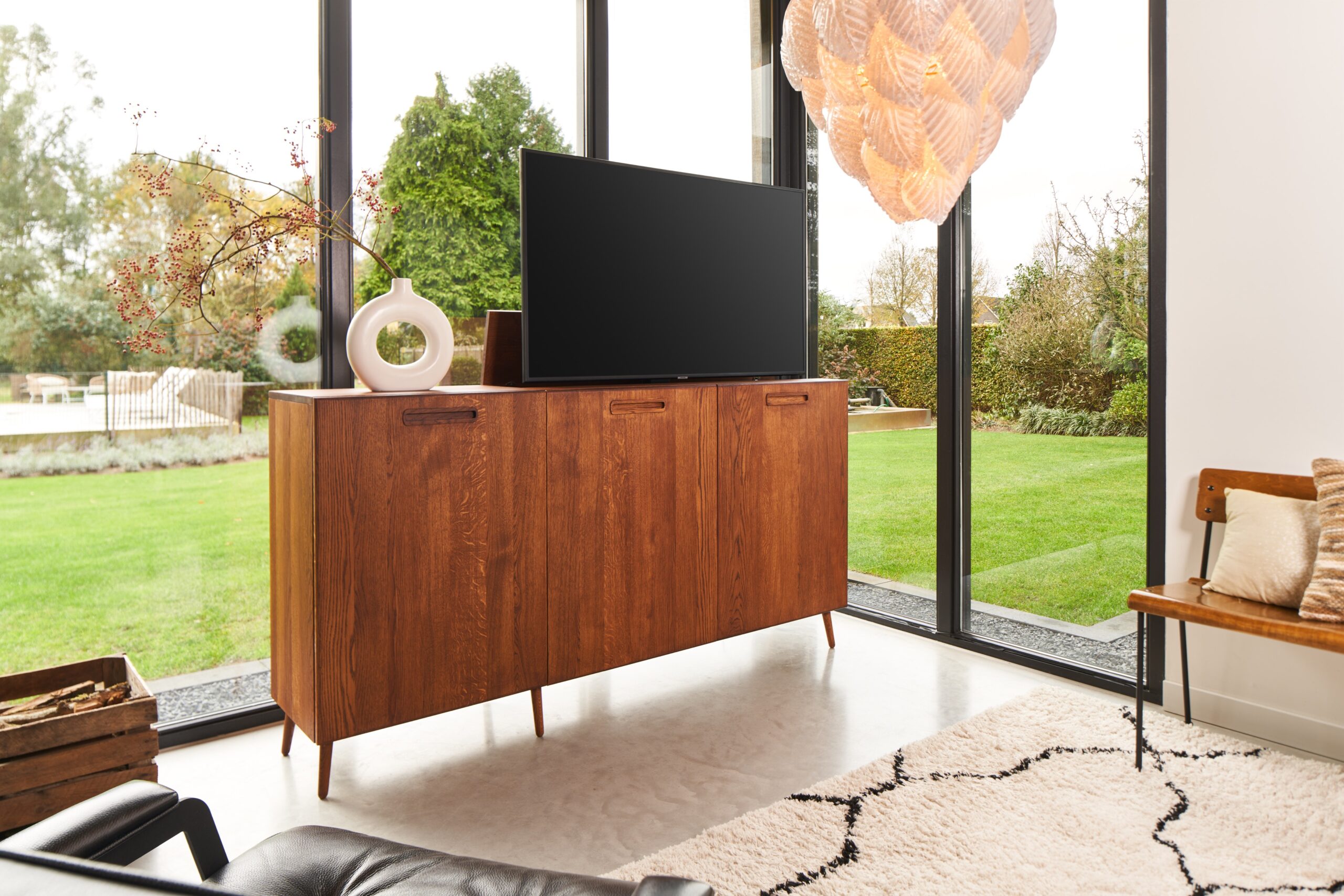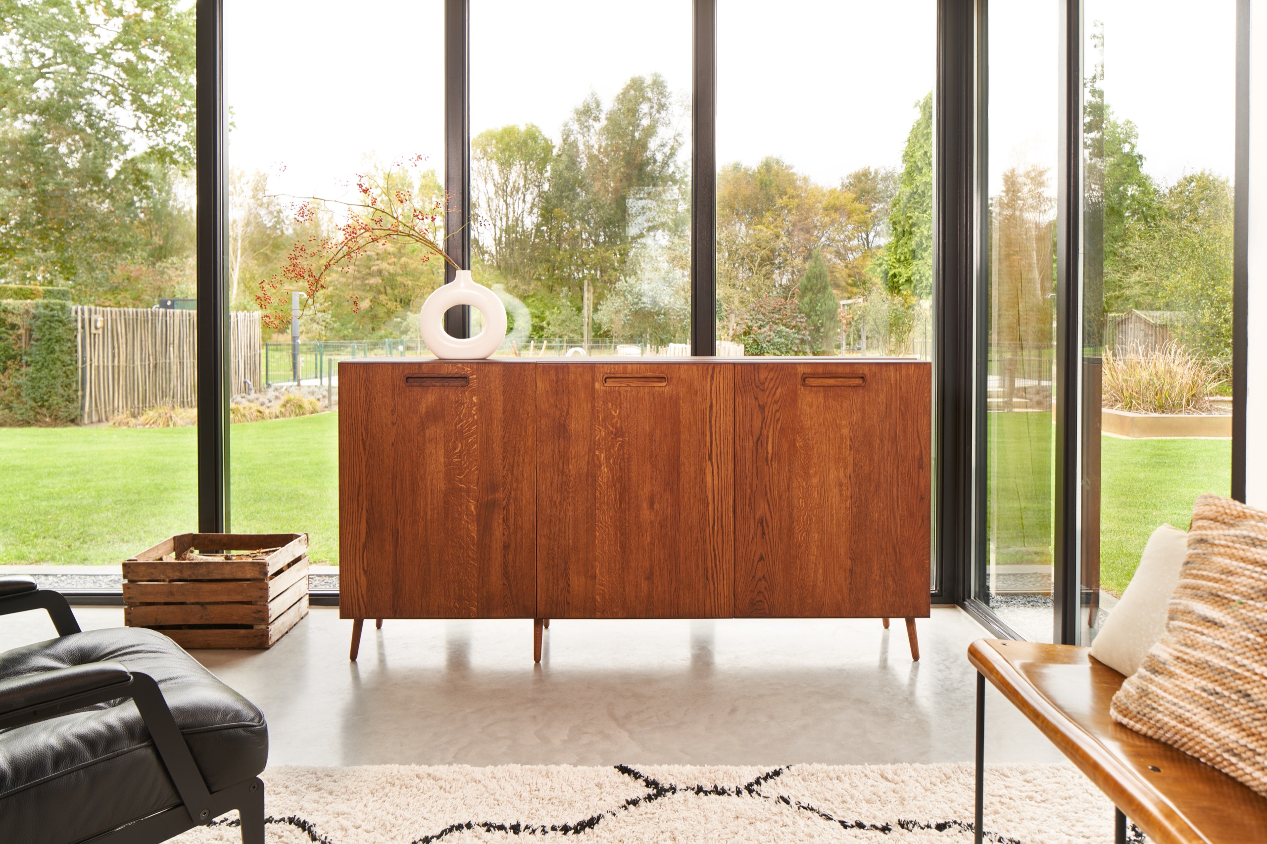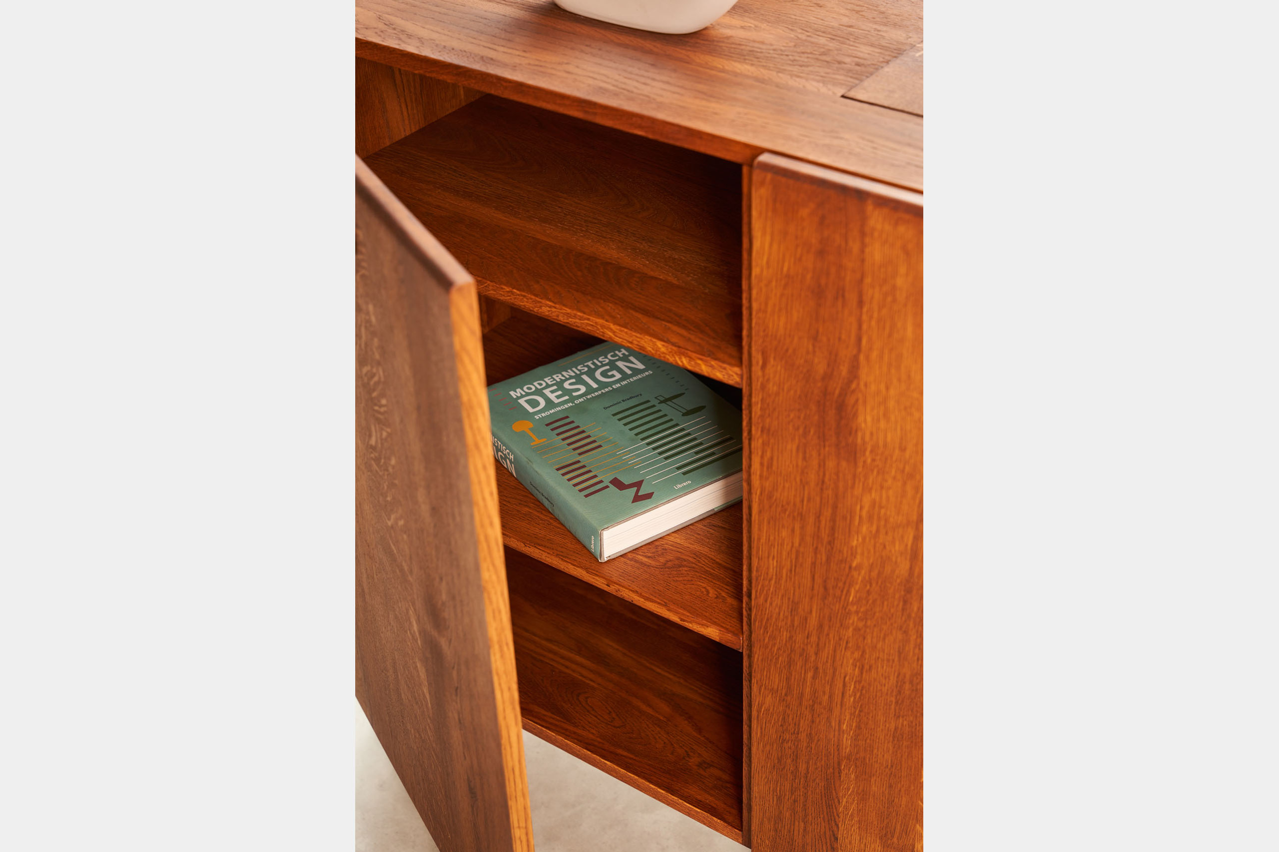 De inspiratiebron voor dit meubel is de Scandinavische woonstijl. In deze woonstijl zie je vaak de ‘Mid-Century’ dressoirs terugkomen. We hebben de typerende stijlelementen van deze meubels gevangen in een geheel nieuw design/product waardoor het past bij het interieur van de liefhebbers van deze populaire woonstijl. Dit meubel is gemaakt van het allermooiste eikenhout en afgewerkt met schuine pootjes en in gefreesde handgreepjes.