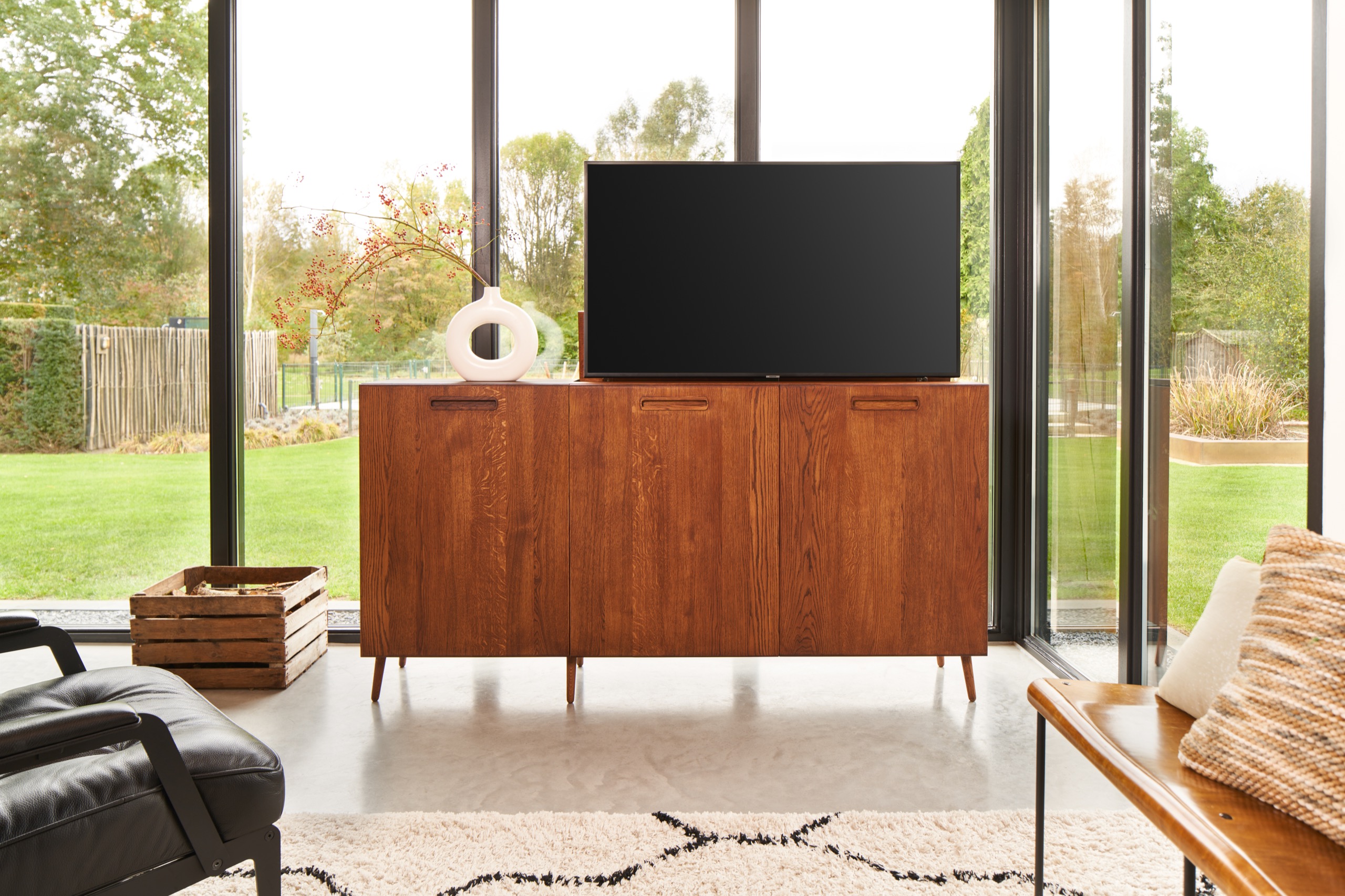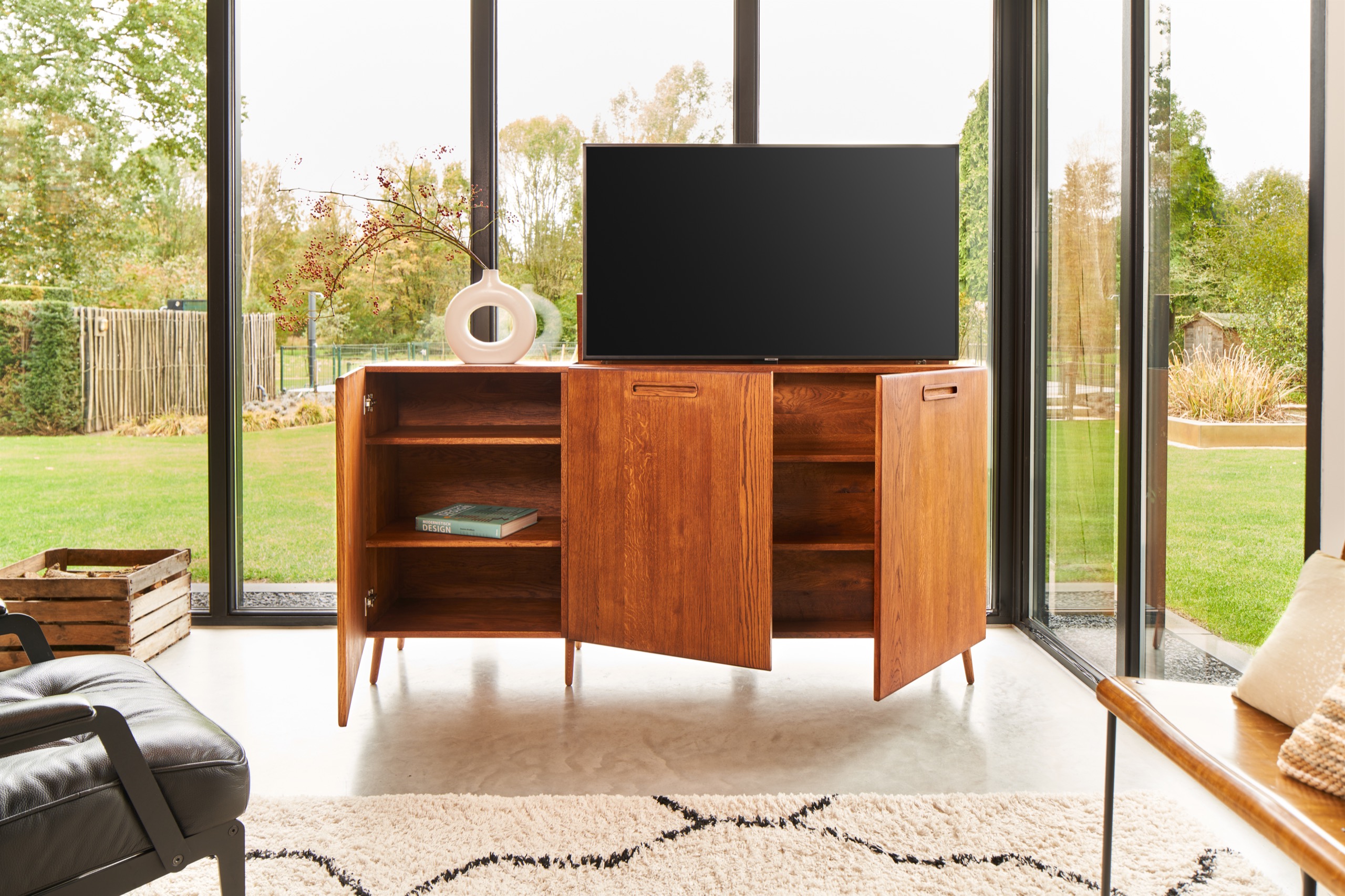 Dit meubel is zowel beschikbaar voor TV’s tot en met 43, 55 en 65 inch. Bovendien is het beschikbaar in zowel een tweedeursuitvoering als in een driedeursuitvoering. Je kunt afhankelijk van je woonvoorkeuren en beschikbare ruimte zelf beslissen welk formaat het meest geschikt is voor jou.